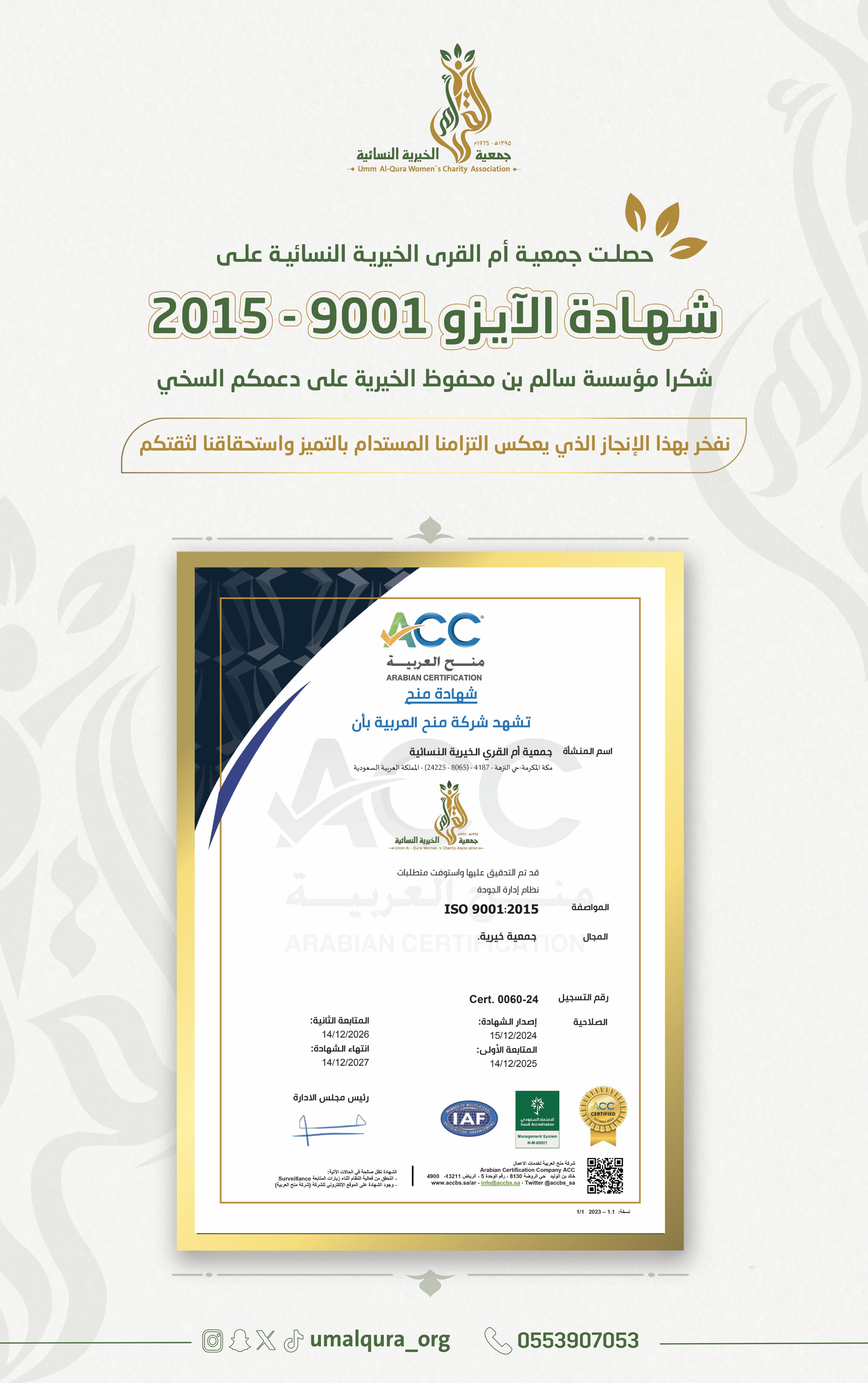17 كانون1/ديسمبر 2024 شهادة الايزو 9001-2015 شكرا مؤسسة سالم بن محفوظ الأهلية على دعمكم السخي نفخر بهذا الانجاز الذي يعكس التزامنا المستدام بالتميز واستحقاقنا لثقتكم+ Facebook Twitter